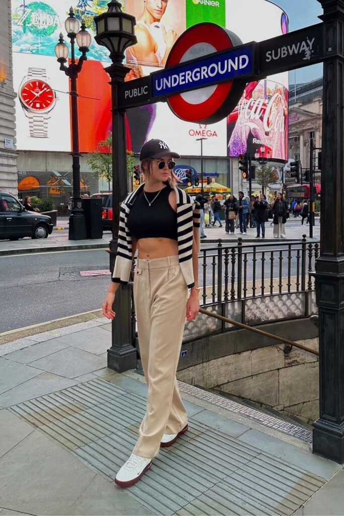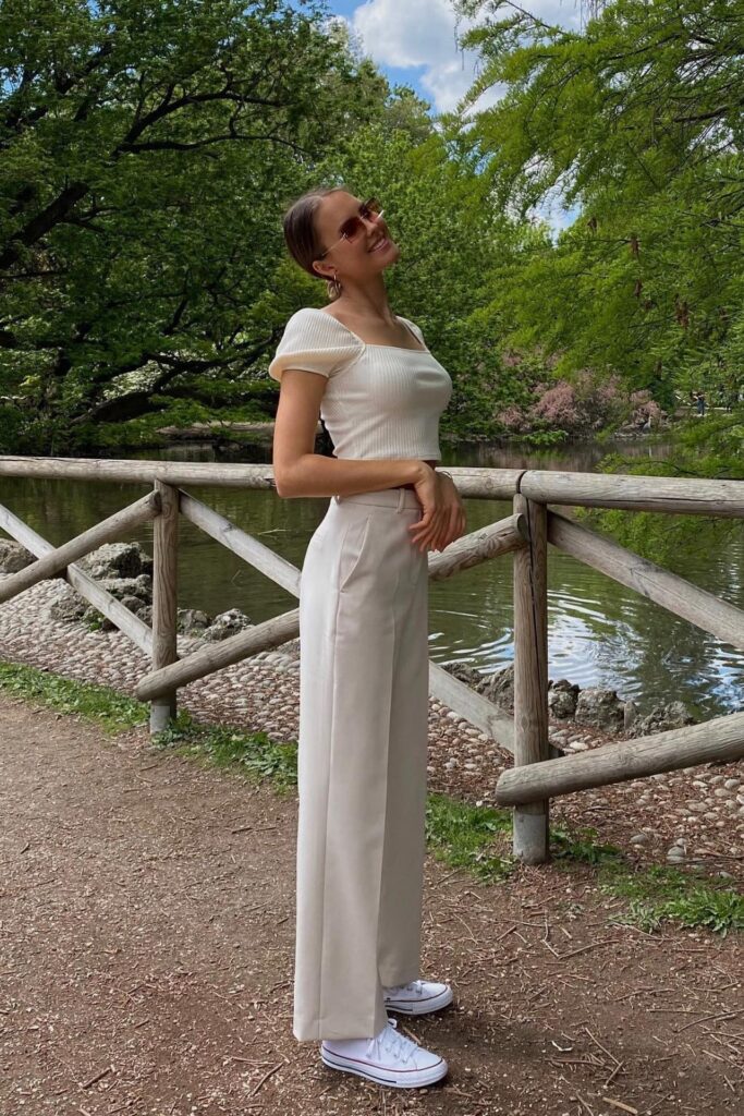 Go full monochrome with a beige ribbed crop top and beige wide-leg pants. White canvas sneakers add a sporty element that keeps the outfit from looking too serious.