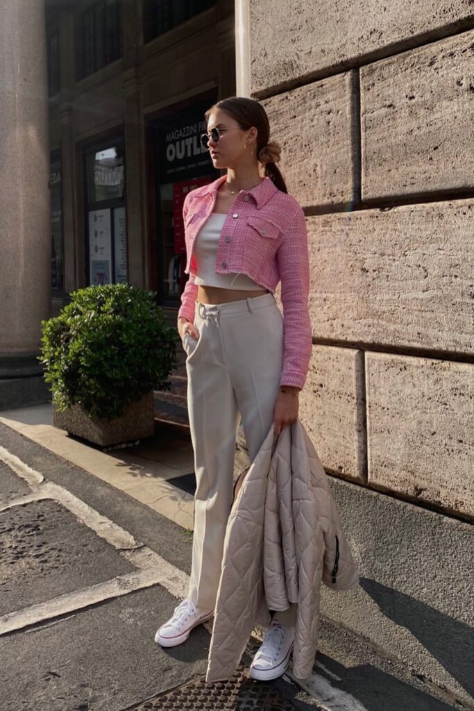 A pink cropped tweed jacket is the perfect way to add some color to beige pants. Wear a white crop top underneath to keep things simple.