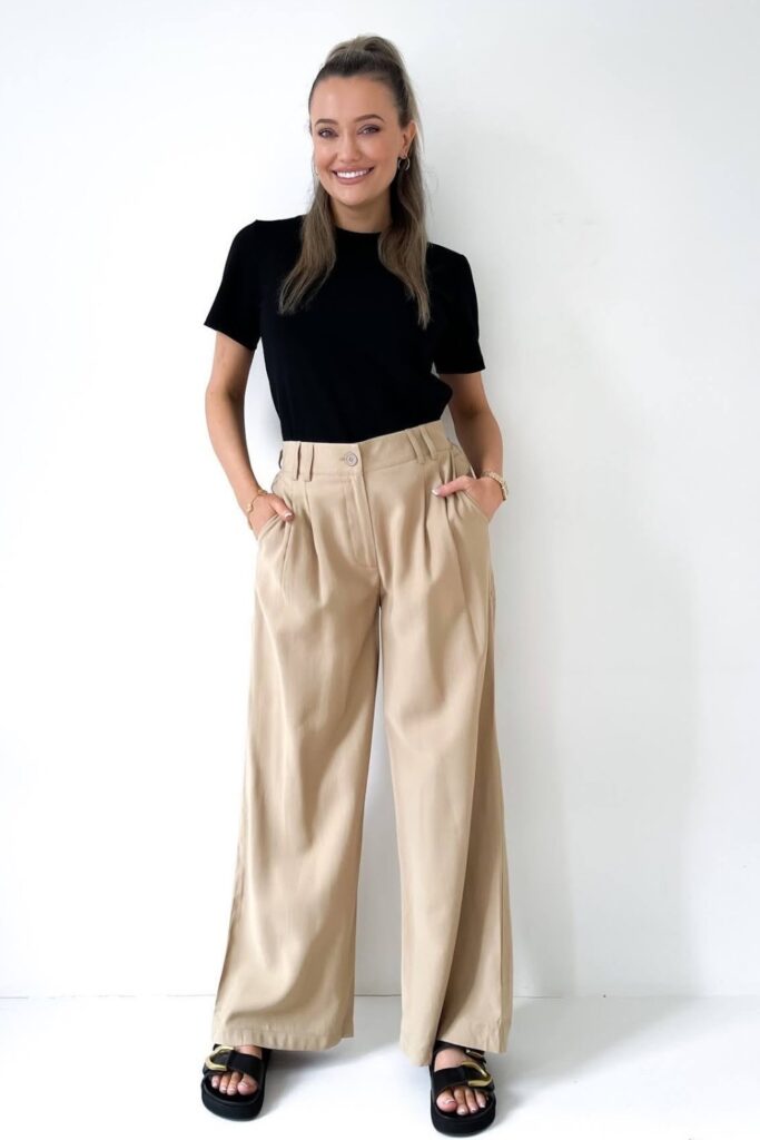 Super simple but so good – just wear a black fitted t-shirt tucked into beige wide-leg pants. Black platform sandals make your legs look miles long.