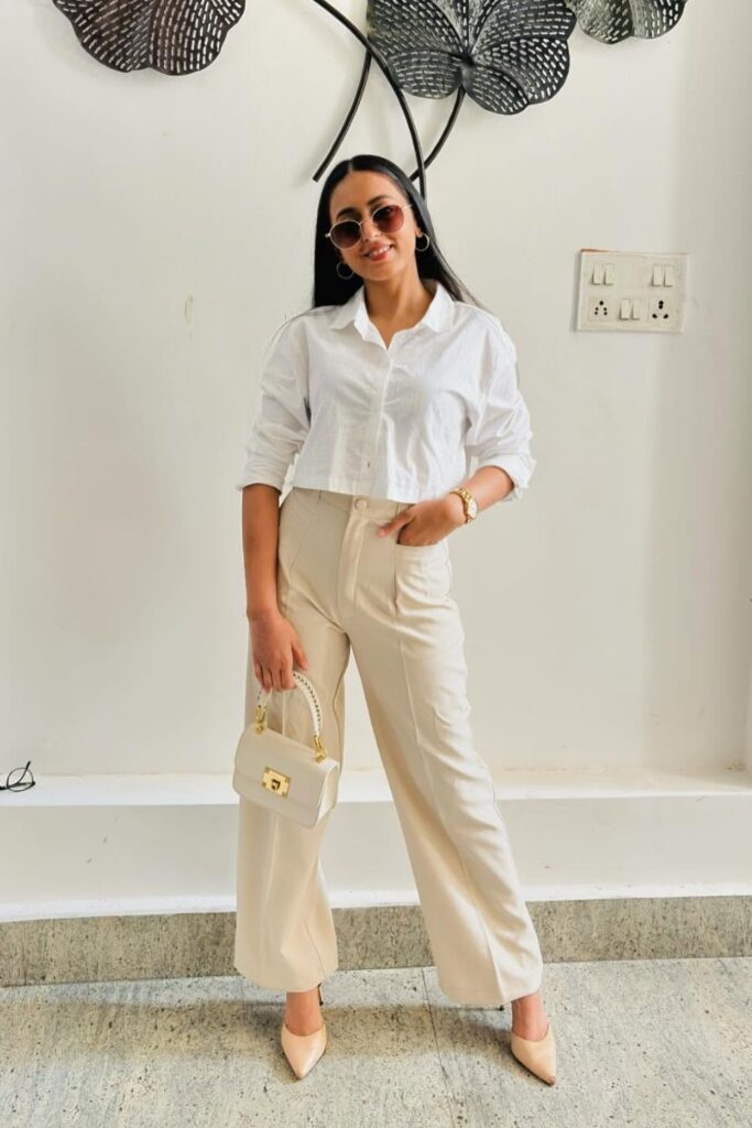 For the office or any dressy occasion, wear a white cropped button-up shirt with beige wide-leg trousers. Nude pointed heels elongate your legs like crazy. Tuck in the shirt to show off the high waist of the pants.