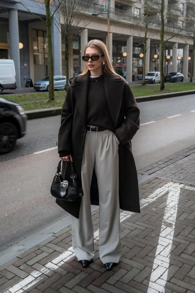 This outfit is all about contrast. Start with beige trousers and then add a black crewneck sweater. Layer an oversized black coat on top for that effortlessly cool vibe.