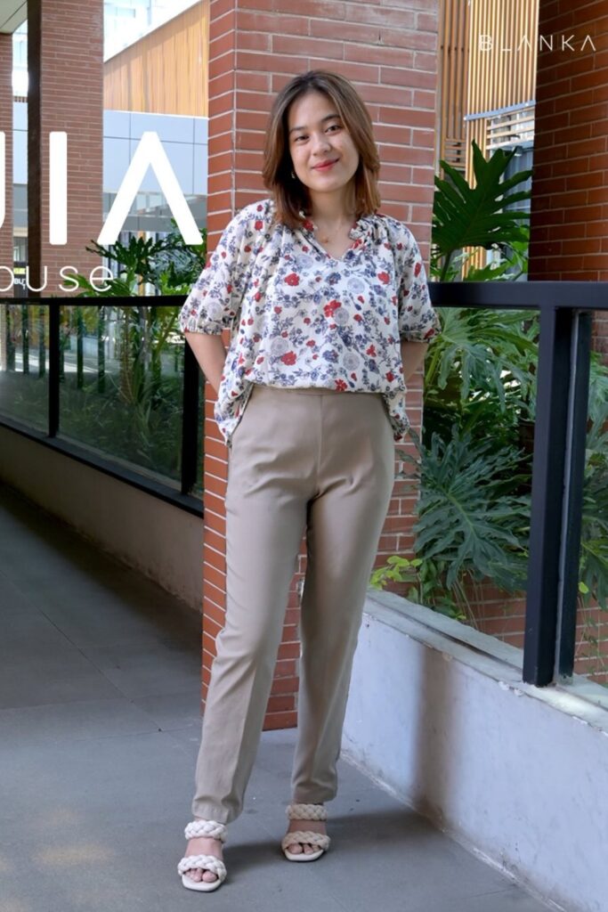 Want something more feminine? Pair your beige pants with a pretty white floral blouse. Cream braided sandals tie everything together and give major summer vibes.