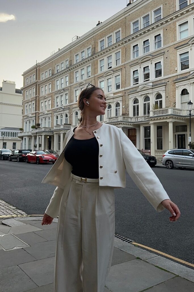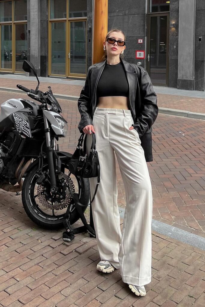 For a more formal vibe, try a white structured jacket with a black fitted top underneath. The beige wide-leg pants balance out the stark black and white on top.