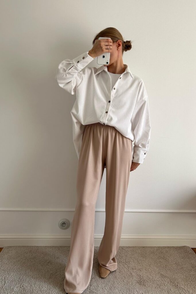Sometimes simple is best. Just throw on an oversized white button-up shirt with beige flowy pants and you’re done.