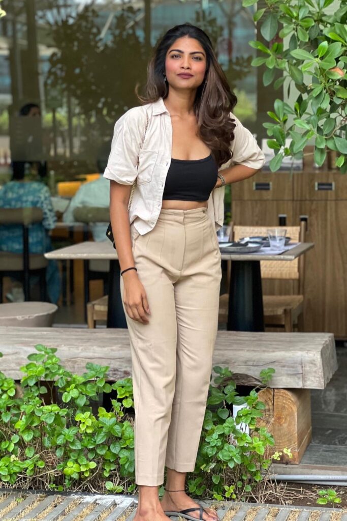 Here’s a fun layering trick: wear a black cropped top underneath and layer a short-sleeve white button-up on top. Leave it unbuttoned and pair with beige high-waisted pants.