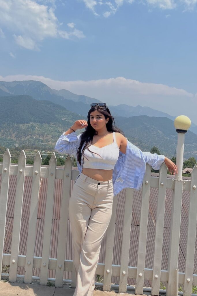 For a preppy twist, layer a light blue striped shirt over a white ribbed crop top. The beige pants ground the whole look and keep it from being too matchy-matchy with all the blue and white. This outfit just looks so fresh and perfect for spring.