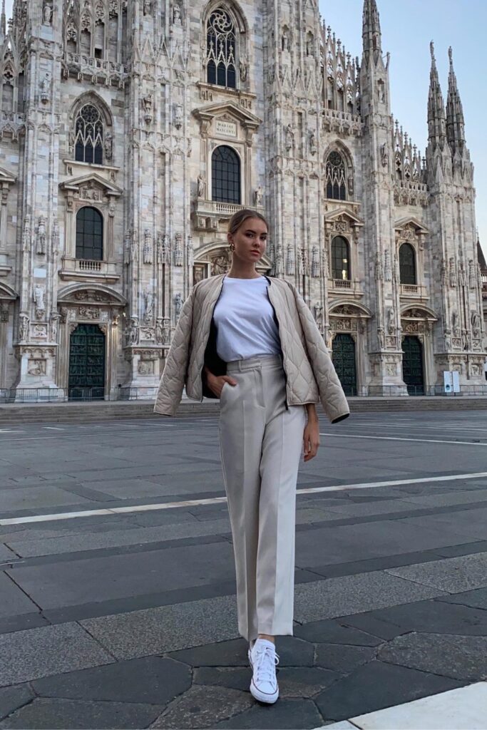 A cream quilted jacket instantly makes any outfit look more expensive. Wear it over a basic white t-shirt with beige tailored pants.