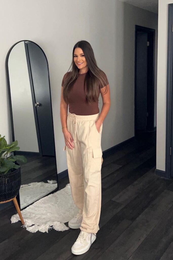 The easiest cargo pants outfit ever? A fitted t-shirt, cargo pants, and sneakers. Make sure the tee isn’t too baggy so you don’t lose your shape completely.