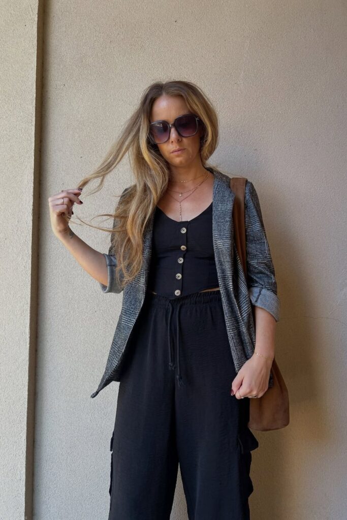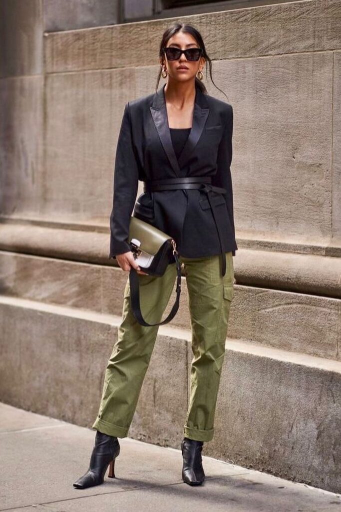 For a more polished take, wear a tailored blazer with a fitted top and cargo pants. Add heeled ankle boots to elevate the whole look.
