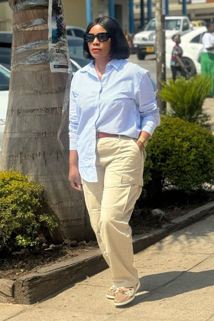 A striped button-down shirt with cargo pants is such a classic combination. You can tuck the shirt in, leave it untucked, or do a half-tuck – whatever feels right.