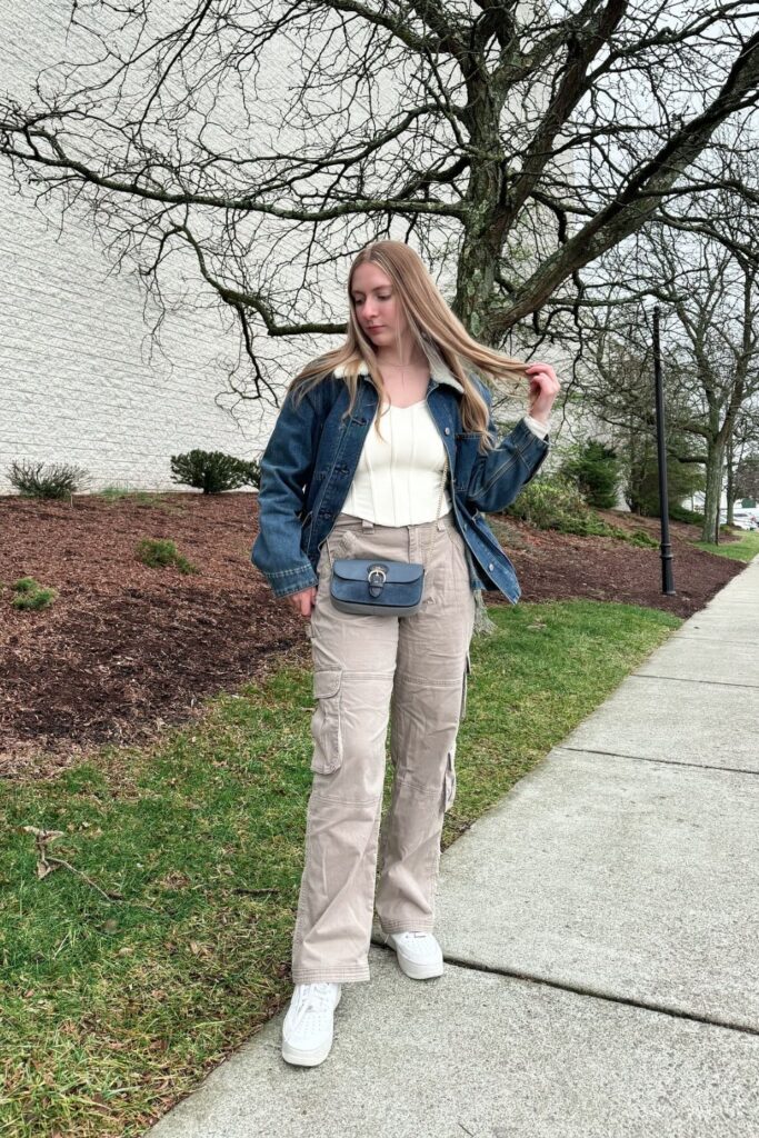 We have a classic blue denim jacket worn over a corset top, paired with cargo pants and sneakers. The corset adds an unexpected element that makes the whole outfit more interesting.