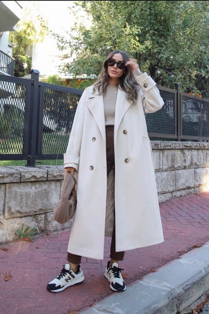 4. Double-Breasted Maxi Coat and Athletic Sneakers