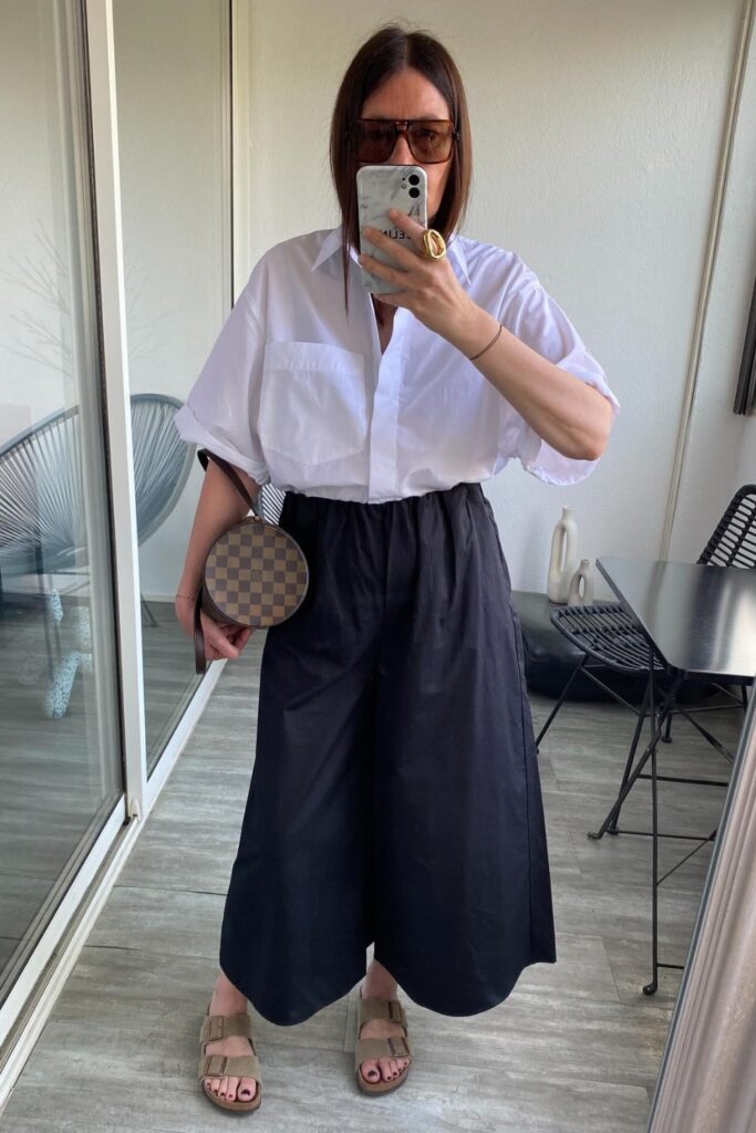 Minimalist vibes all the way with this one. An oversized white button-up looks incredible with black wide-leg culotte pants.