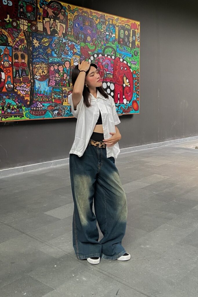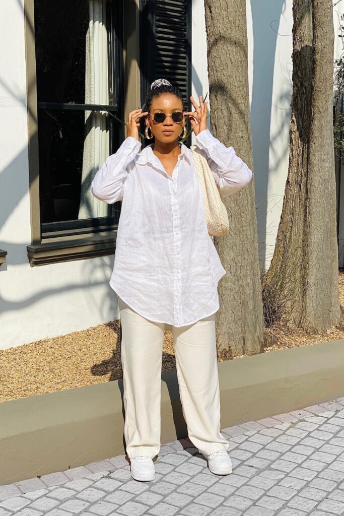 Wear an oversized white button-down with cream wide-leg pants and white sneakers. The whole outfit feels effortless and perfect for summer days.