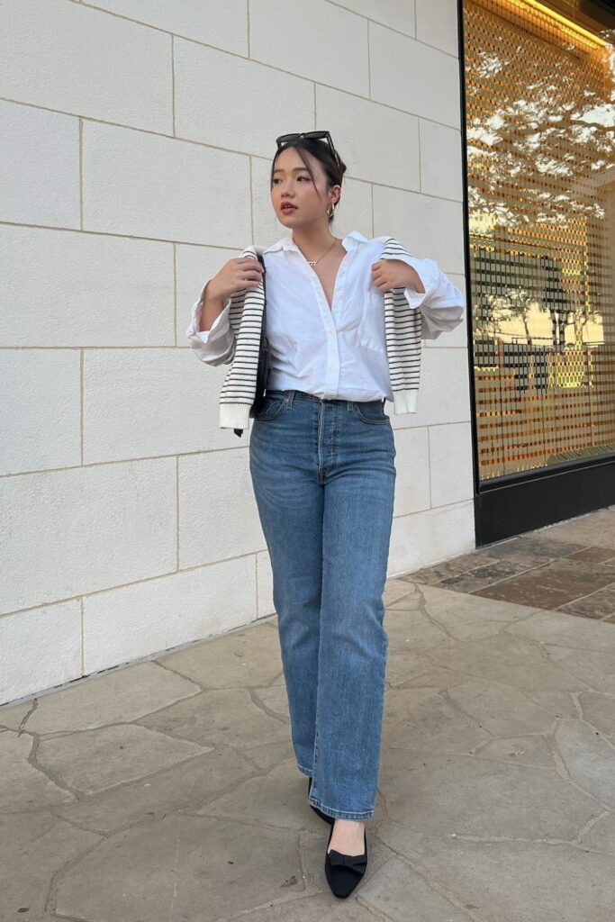 Sometimes you can’t beat the classics. A crisp white button-up tucked into straight-leg jeans is always a good idea.