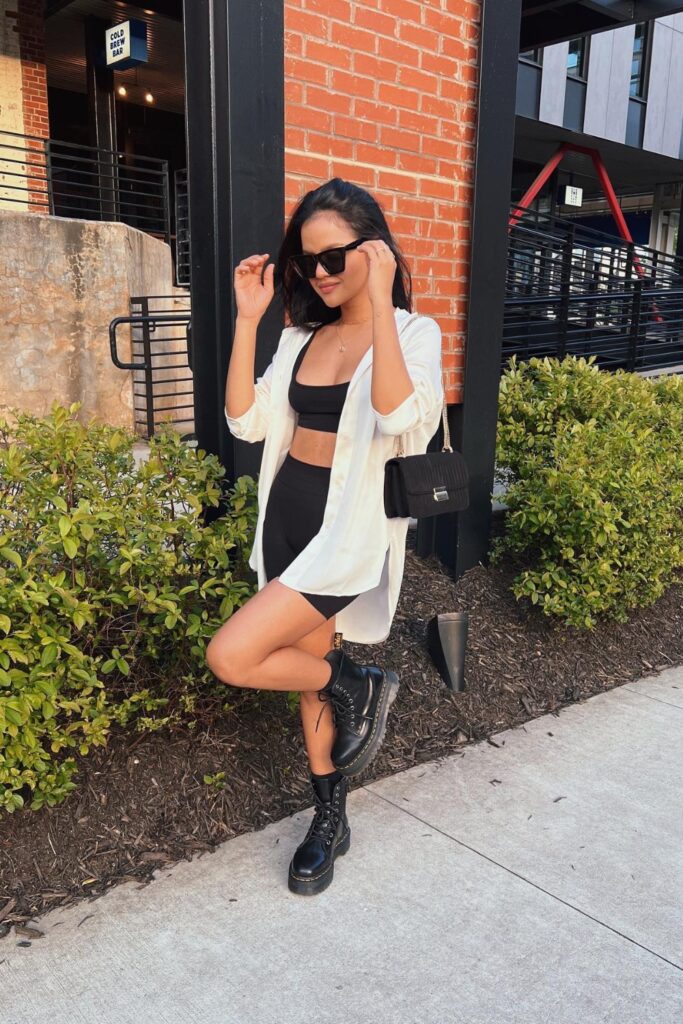 This combination might sound weird but trust me on this one. Wear a white oversized shirt over a black sports bra with black biker shorts.