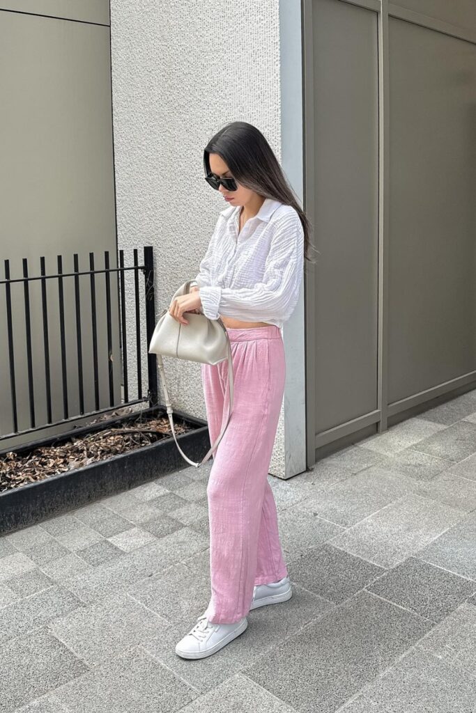 Add some color to your wardrobe with pink wide-leg pants! They look so good with a simple white button-up shirt.