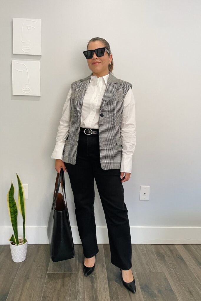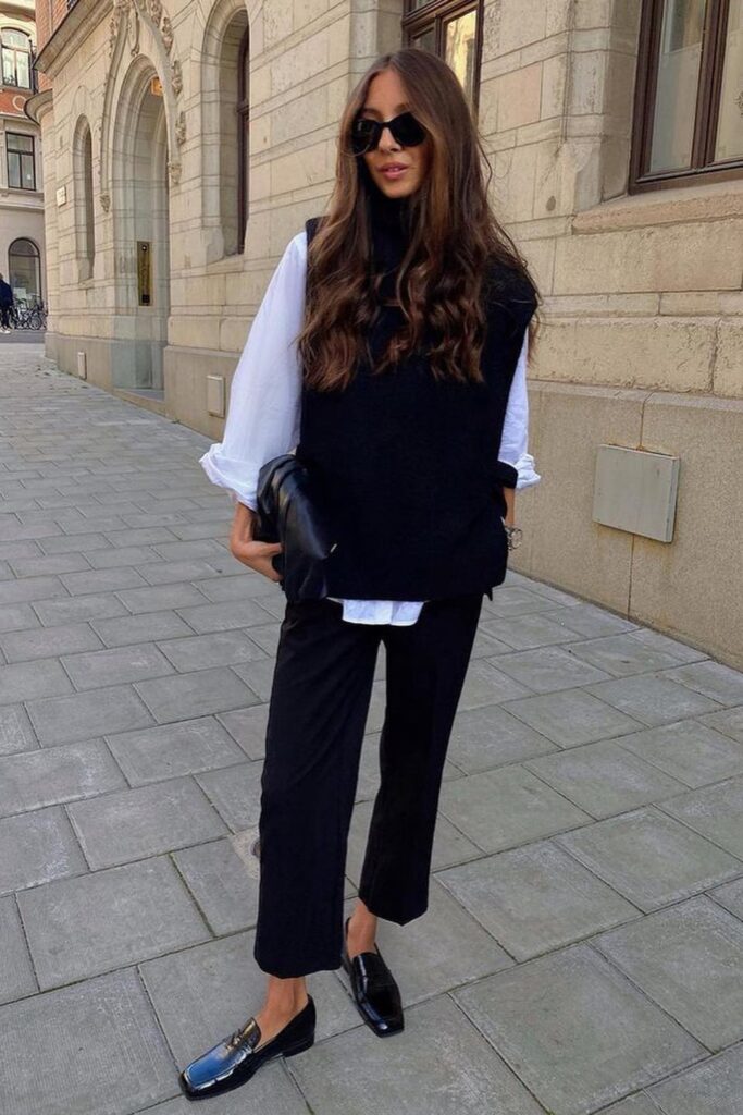 Add black straight-leg trousers and black leather loafers for a look that’s giving academia vibes but in the best way. Perfect if you want to switch up your office wardrobe.
