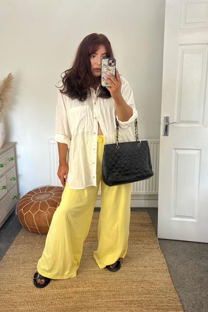 Bright yellow pants might seem scary but they look amazing with a white oversized button-up!