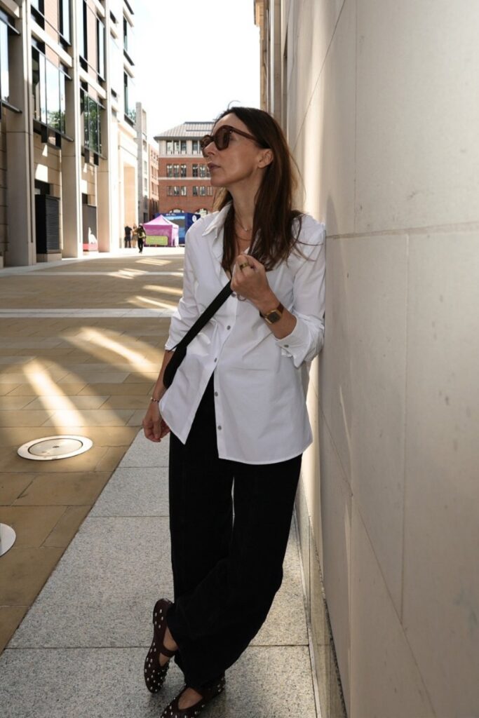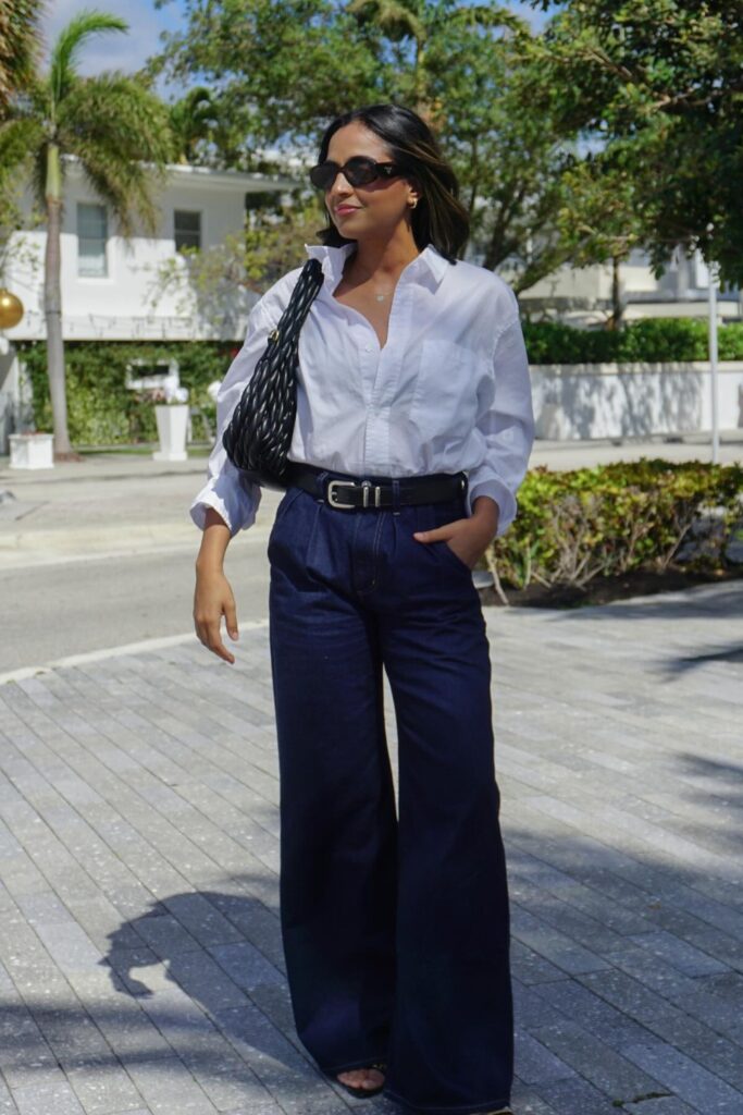 A structured white button-down looks amazing with dark denim wide-leg pants. The key is choosing a shirt with good structure – not too flowy or thin.