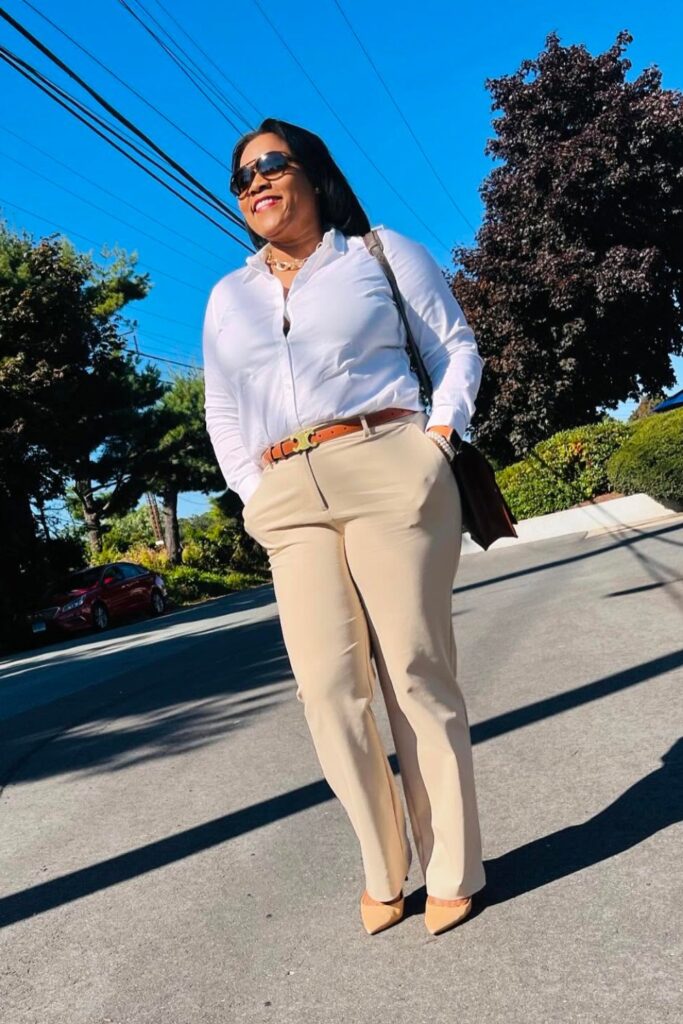 Neutral lovers, this one’s for you. A white button-down with tan trousers creates such an expensive-looking outfit.