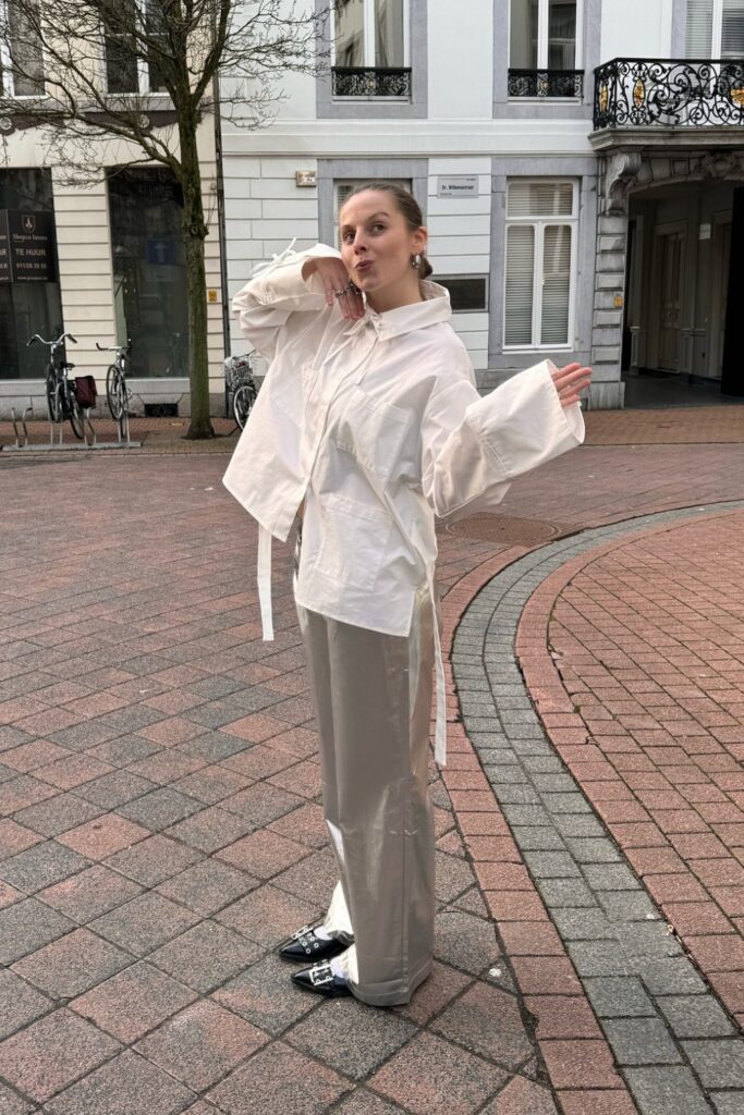 11. White Oversized Button-Down and Cream Wide-Leg Pants