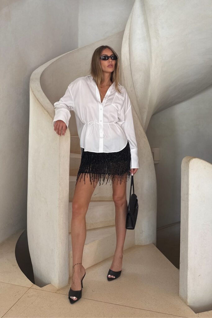 This outfit is giving major party vibes! Start with a classic white button-up shirt and tuck it into a black fringe mini skirt. The fringe adds so much movement and fun to the look.