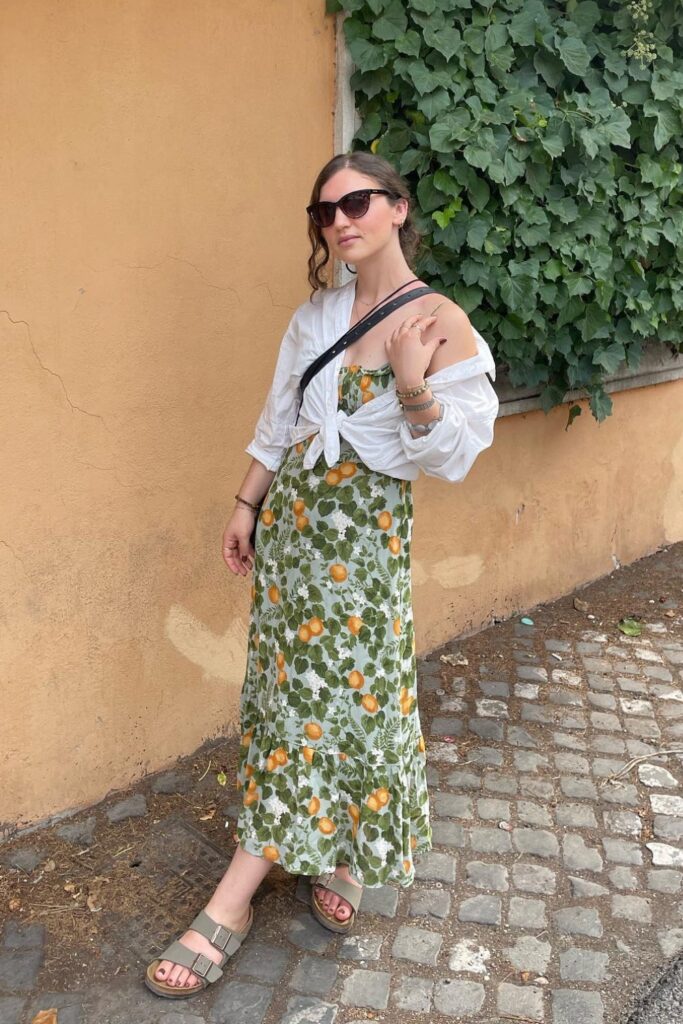 This is such a creative way to style your white shirt! Wear an oversized white shirt open with a front tie over a floral sundress.